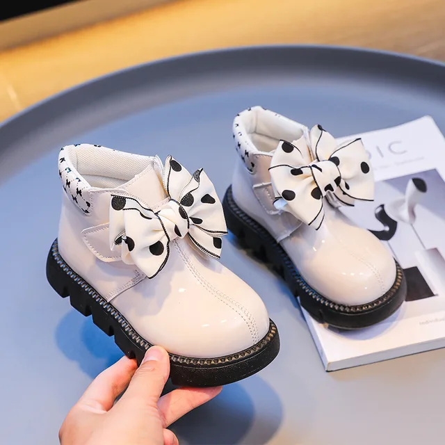 Ces jolies bottes pour fille allient style et confort ! Disponibles en deux coloris élégants — noir brillant et blanc épuré — elles se distinguent par leurs nœuds à pois qui ajoutent une touche chic et ludique.